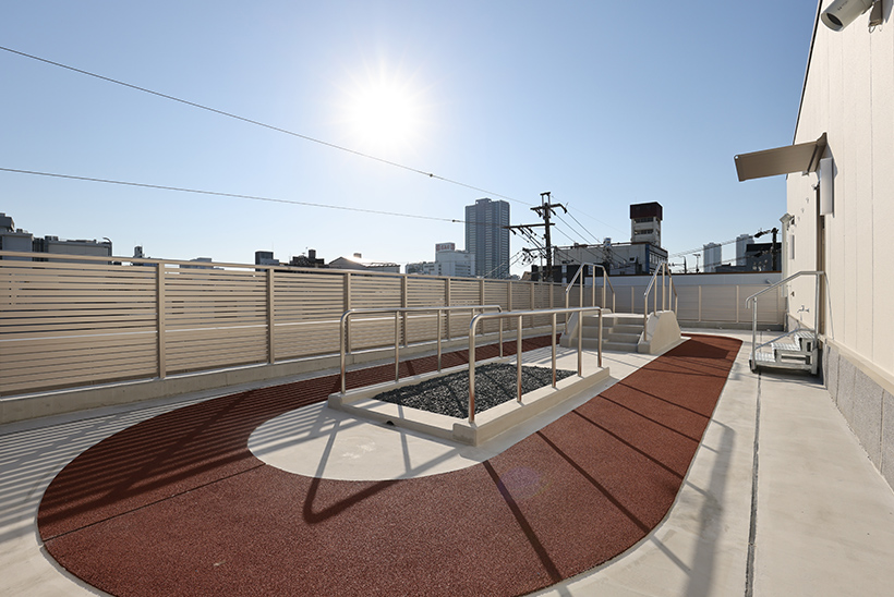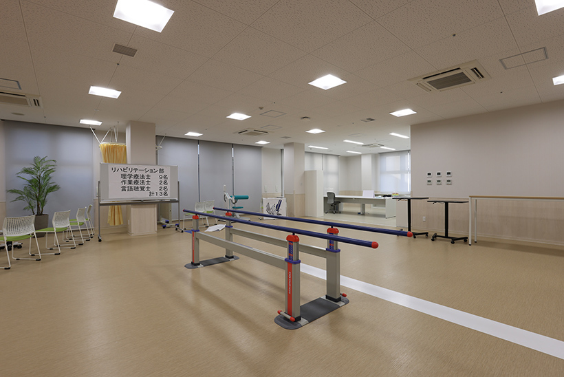 新病院は、各種リハビリテーションが1ヶ所で行える、ゆったりとしたスペースを1階に設けました。さらに、3階には開放的な気分が味わえる屋外リハビリテーションスペースを設置。また、舊病院では2階に設けられていたデイケアは、利用者様の利便性を考慮し、1階のリハビリテーション室に隣接させています。