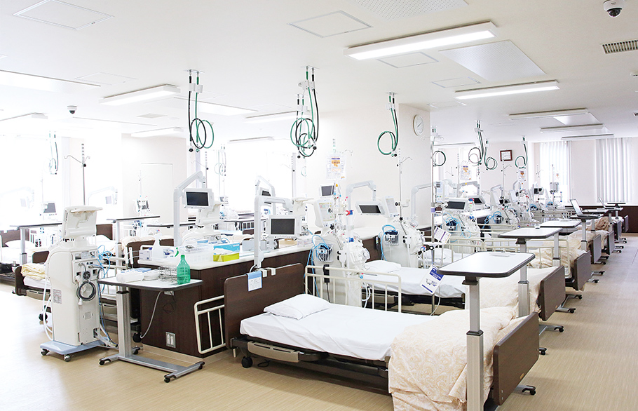 住宅型有料老人ホームの6階は、人工呼吸器対応フロア。全30室は、レスピレーター(人工呼吸器)の機器が接続可能な仕様となっています。病院部分には人工透析30床を設(shè)け、外來に加え、透析治療の必要な入居者様への対応も高めておられます。
