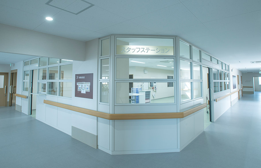 退院が困難な患者様の高齢化は進み、認知癥を伴うケースも増加。こうした狀況から將來的な病床転換も視野に入れ、認知癥治療病棟の施設基準に適応できるよう施設設計され、外來患者様も來やすいようにエントランスも開放的にしました。