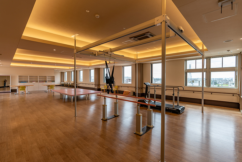 土地探しでお世話になったので、施設づくりも大和ハウスさんにお任せしようという流れになりましたが、設計段階から數々の要望を実現していただき、とても感謝しています。意見をまとめてきた各部門の責任者と行う月に2~3度の打合せでは、基本設計が煮詰まるまでにいただいた提案は、実に10數案にも上りました。それは、途中コロナ禍となったことが影響したのですが、おかげで、さまざまな角度から感染対策を盛り込むことができ、非常に満足しています。また、私たちが最もこだわった動線についても、想像以上にシンプルな仕上がりで、とても動きやすく改善を実感しました。また今回、機能向上のために4階すべてをリハビリテーションスペースとしました。他のフロアよりも天井を高くした広々とした空間は、窓の外に広がる景色も良く、患者様からも好評です。
