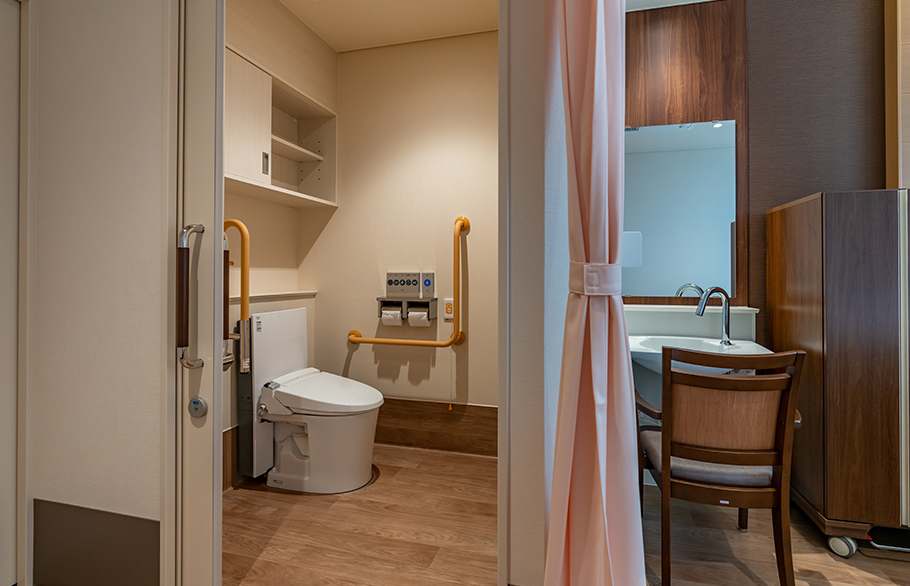 同じく、感染対策の一環として、病床構成も見直されました。個室の割合を上限いっぱいまで増やし、舊病院では各階に1ヶ所のみだったトイレを各室に設置(多床室は2~3室毎に1ヶ所)しています。