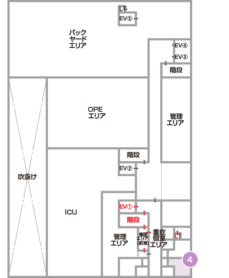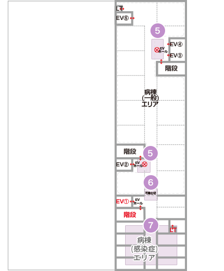 感染癥患者対応病棟は、対象フロアのみEVホールを仕切り壁で區(qū)畫する設(shè)定とする感染癥病棟の設(shè)定時(shí)は、非常時(shí)以外は出入り不可