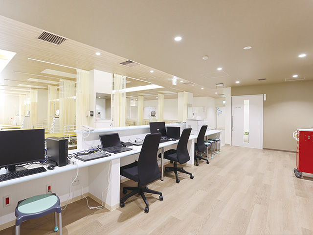 業務の疲れを癒す効果が期待される木目調のデザインや園と光を取り入れた空間とした食事?休憩室、外部からの騒音で睡眠を妨げられない宿直室、効率的に集中して事務仕事を行える醫局スペースなどをご提案しています。