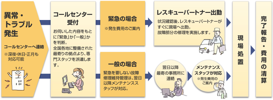 事態をうかがって<緊急>か<一般>かを判斷し、全國各地に張り巡らされた最寄りの拠點より専門スタッフを派遣します。