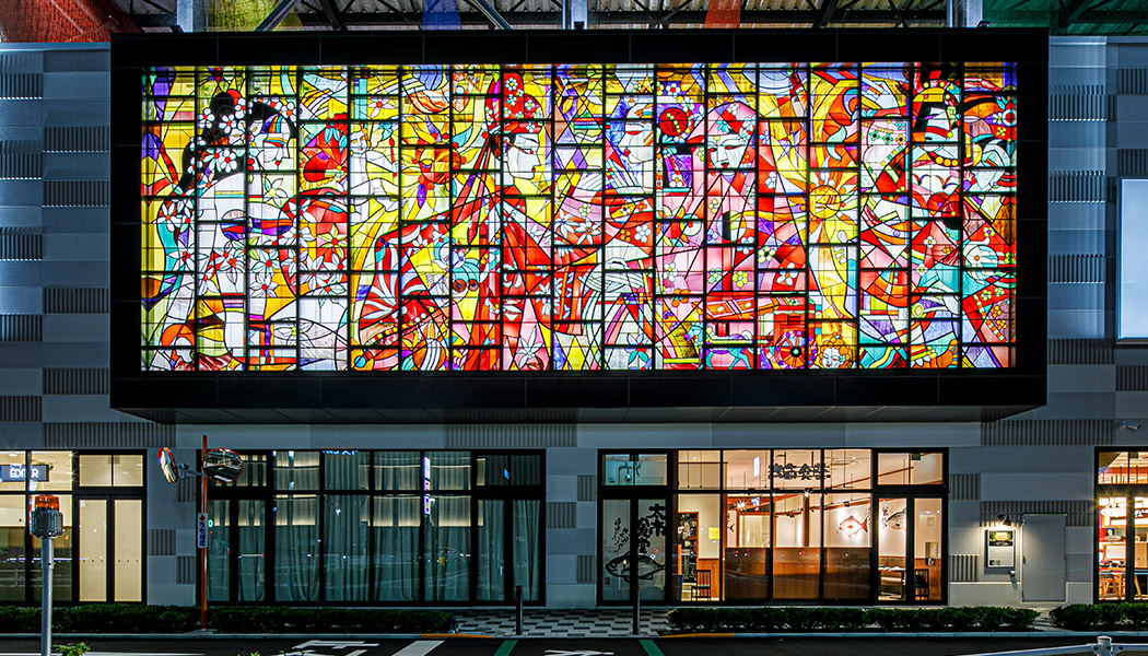 施設正面には、舊施設の顔として愛されてきたステンドグラス「ラスティングメモリー(忘れなき思い)」を継承して設置。また、障がい者や高齢者、お子さま連れの方など、さまざまな方が快適にお過ごしいただけるよう凹凸の少ない床材や、高さ調整が可能なテーブルなどユニバーサルデザインを採用しました。