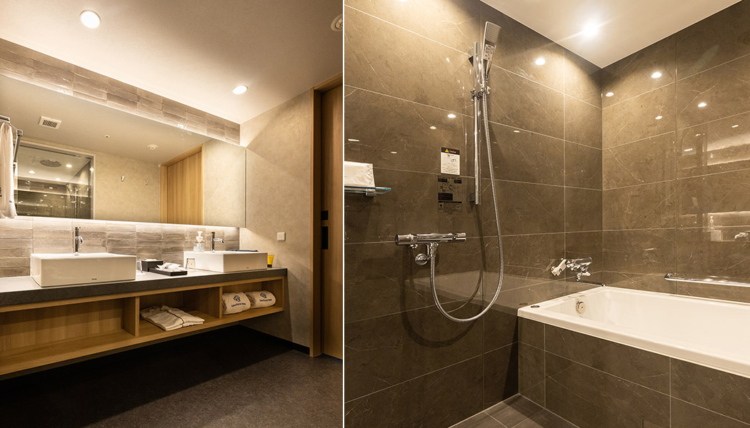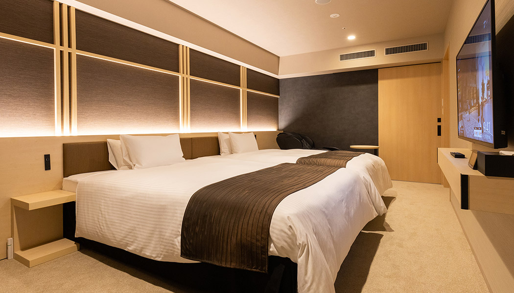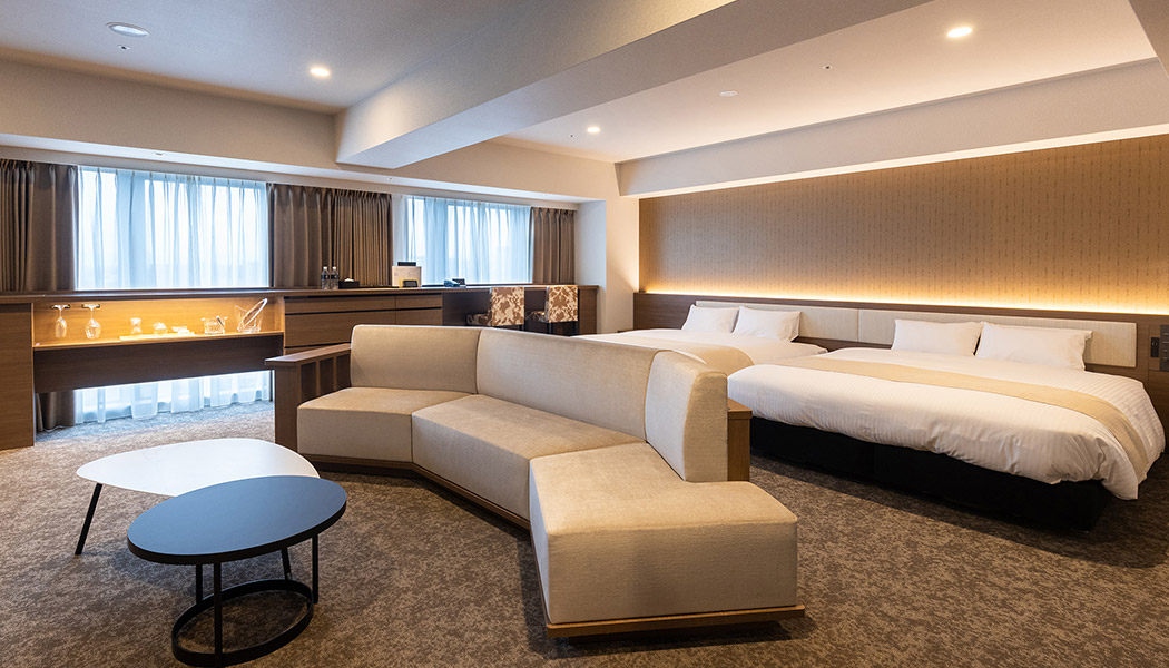 當ホテルは熊本市內の繁華街にあり、利便性が高い立地です。熊本地震で大きく被害を受けた商業施設の跡地に、土地オーナー様の「震災から復興し、街に人を呼び戻したい」という想いを受けて開発されました。外観は「熊本城」の「いぶし瓦」をイメージした銀色と木の溫かみを組み合わせ、內壁は黒を基調とし、熊本らしさを感じられるデザインです。