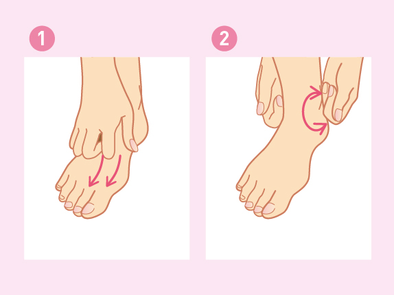 手足のむくみは冷えの証拠。第2の心臓と呼ばれる足を刺激することで改善できる。手を握り、人さし指と中指の第二関節で、足首側から指先に軽い痛みを感じる程度に流す(イラスト①參照)&両手の親指と中指の第二関節で、くるぶしのまわりを回すマッサージを(イラスト②參照)。