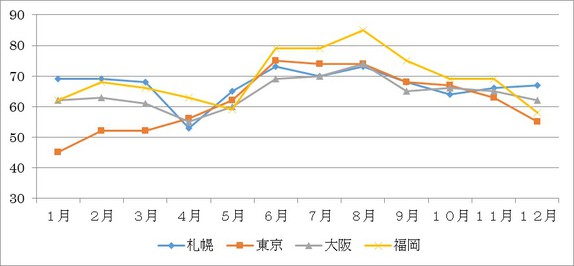 梅雨時期に濕度が上がるイメージがありますが、4月以降濕度はじわじわ上がっています。全國的にみても年間を通じて60%前後濕度がありますが、気を付けたいのは気溫も上がり始める梅雨シーズン以降です。
