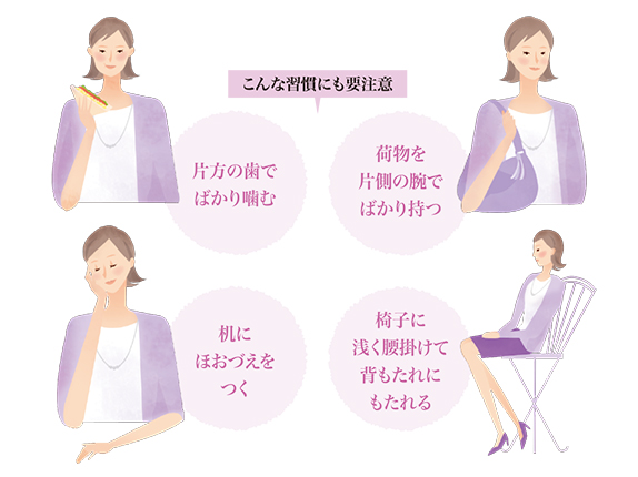 人の動(dòng)作や姿勢(shì)にはさまざまなクセがついています。間違った姿勢(shì)や無理な動(dòng)作を長年続けていると、骨格や背骨のゆがみが生じてしまいます。寢る時(shí)は、橫向きやうつぶせ寢の姿勢(shì)はNG。立っている時(shí)は片方の足にばかり體重をかけてはいけません。また、座っている時(shí)は腳を組まないように気をつけましょう。
