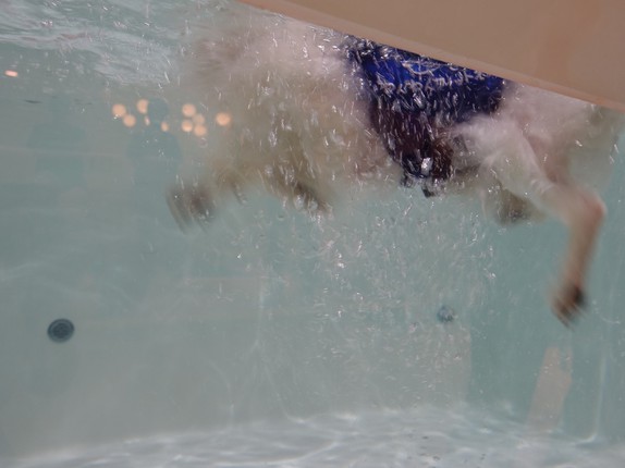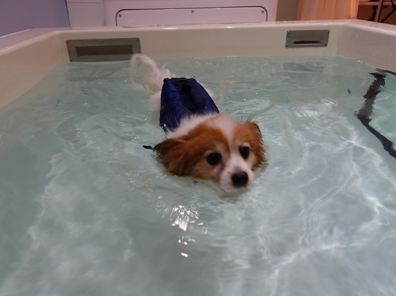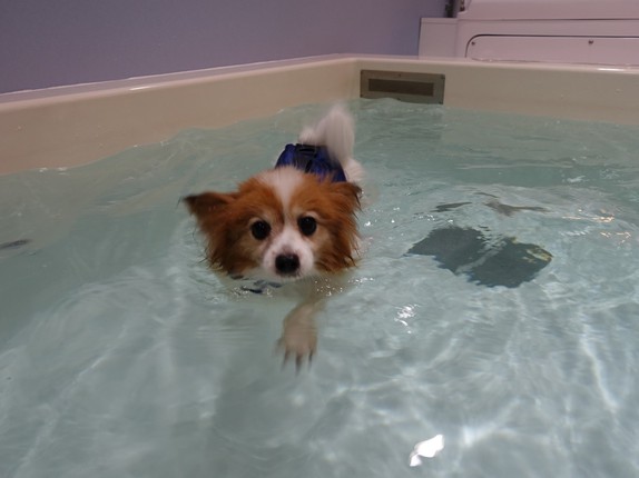 泳げない犬の方が多いです。この犬(寫真)は9才になってからプールデビューしましたが、3~4回目で泳げるようになりました。パピヨンの場合、足に筋肉がないと膝蓋骨(膝の関節の皿)脫臼になる可能性があるので、関節の周りを筋力で支えて怪我や病気を防ぎます。