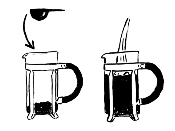 1.粗挽きに挽いた豆を入れる(120ccに対して7gが目安)。 2.お湯(90~96℃)を注いでマドラーなどで軽く混ぜてふたをする
