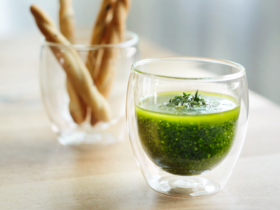 1944年の創(chuàng)業(yè)以來、飽きのこないシンプルなデザインと機能性を兼ね備えた製品を世に送り出しているボダム。その主力アイテムの一つが、斷熱性に優(yōu)れたダブルウォールグラスです。「ダブルウォールとは、名前の通り二重の壁のこと。耐熱ガラスの二重構(gòu)造で、間の空気層が斷熱材の役割を果たしているんです」と渡邉さん。この構(gòu)造によって、飲み物の溫度を長時間保てるそう。斷熱性能は高く、熱い飲み物を入れても素手で持てるというから驚きです。「外気の影響を受けにくいので氷を入れても結(jié)露しにくく、コースターいらず。氷もほとんど溶けないんですよ」(日高さん)。