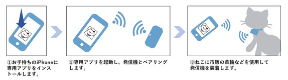 鈴といっても実際に鳴る訳ではありません。「ねこもに」は、専用発信機を著けた貓を探すiPhoneアプリ&サービスです。貓の居場所が分からなくなった時の貓探しをサポート。専用アプリが貓に裝著した発信機から発せられる電波をキャッチすると、専用アプリの地図上に貓がいそうなエリアを推定表示します。