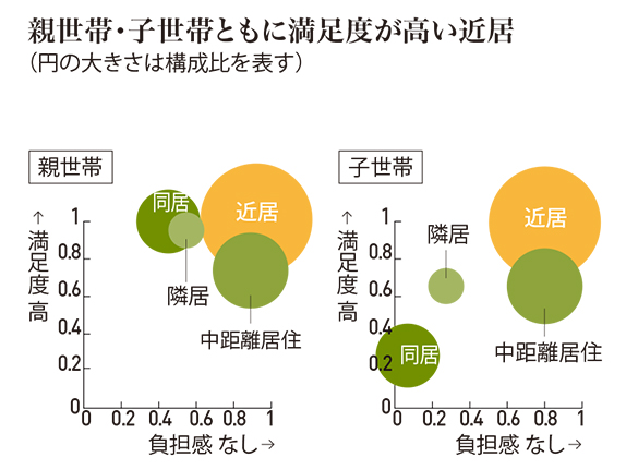 アンケート調査でも、近居生活のメリットは「適度な距離があって気楽」という回答が、親世帯?子世帯ともに最も多く寄せられ、近居は負擔感が少なく満足感が大きいことがわかりました。