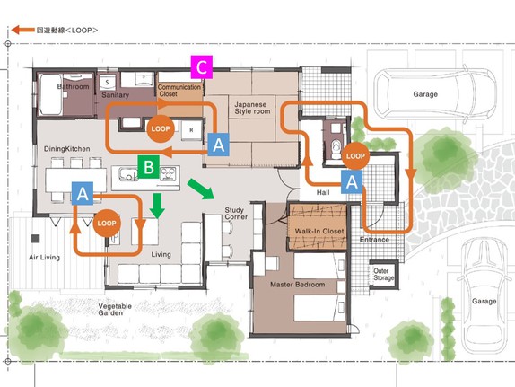 この近居と育孫の発想から、親子3世代のコミュニケーションを支える親世帯の住まいをご提案しています。柱となるのは、「安心みまもりプランニング」、「コミュニケーションデバイス」、「フレンドリーデザイン」の3つのポイントです。特に、死角が少なく見通しの良い空間構成や、子育てに適した回遊動線が特徴です。