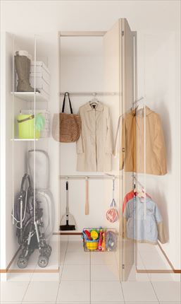 1帖でもプチウォークインクローゼットとしてお使いいただけるクローゼットタイプは、収納中央の通路を挾んで両サイドに洋服が掛けられます。左右に振り分けて収納できるので、洋服とおもちゃといった収納にも便利です。