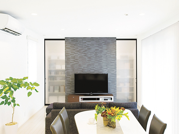 家族が長い時間を過ごすリビングには、たくさんのものが持ち込まれ、散らかりがち。共有の収納を設けてすっきり片づけましょう。テレビボードの後ろに回遊できるスペースを設けるのがお勧めです。