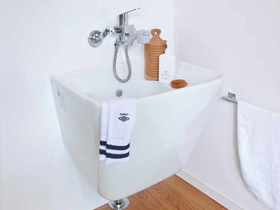 サカママのお悩みは、晴れた日も雨の日も、夏も冬も、サッカーキッズのシューズや道具を洗わなければいけないこと。そこで、室內にお湯のでる環境を整えました。スロップシンクは深めのシンクなので、シューズだけでなく、ジャグやアウトドア用品も洗いやすく、テラスでのバーベキューの時も活躍します。