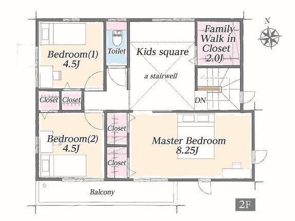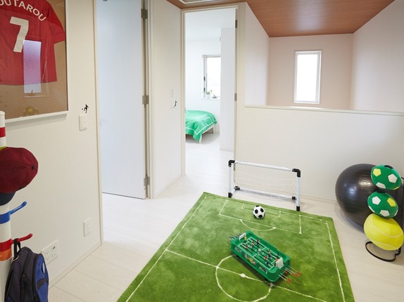 2階ホールを少し大きめにつくり、キッズが自由に遊べる空間にしました。急な來客の際も散らかしたままでよく、リビングをきれいに保てます。途中で壊したくない積木など出しっぱなしで怒られません。個室にこもらずきょうだいで過ごしたり、家具を置かない広めの空間なので、ママやパパのストレッチの場としても利用できます。合わせて、1階と吹き抜けでつなげると、家族の気配も感じることができます。