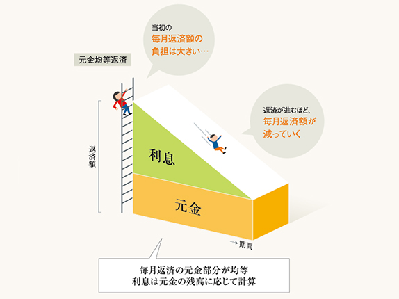 「元金均等返済」は、返済額を構成する借入元金の返済部分が返済期間を通じて均等となる返済方法です。利息の支払いは元金の殘高に応じて計算されるため、返済が進むにつれて減少します。元金返済部分が一定額で、支払利息の減少により住宅ローンの返済額が毎月少しずつ減っていくのが「元金均等返済」の特徴です。