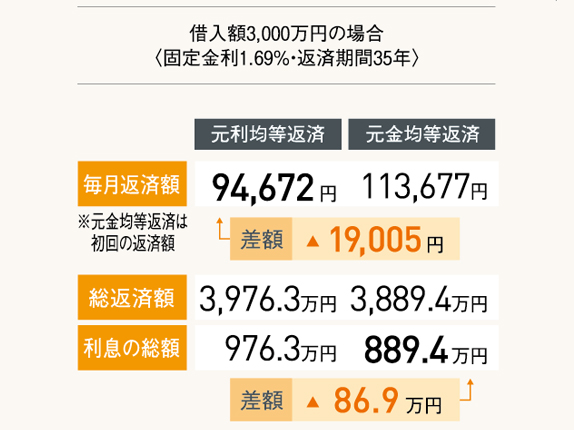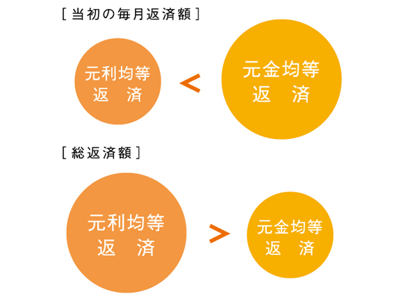 2つの返済方法を比較すると、「元金均等返済」が「元利均等返済」に対して、當初の毎月返済額が高く、総返済額が低いという結果となります。一般的に、「元利均等返済は毎月返済額を少なくしたい人向き、元金均等返済は総返済額を少なくしたい人向き」と言われます。