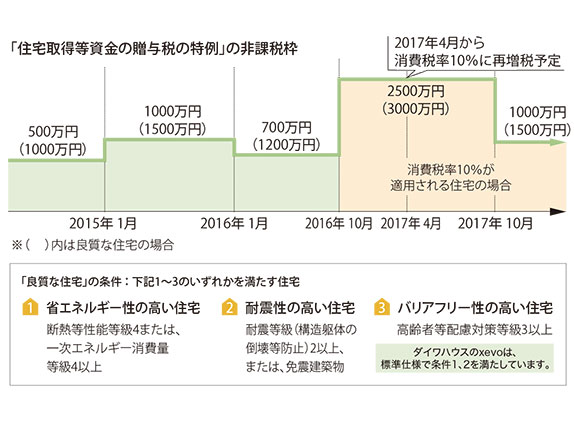両親や祖父母などから住宅取得等の資金の贈與を受けた場合、一定金額まで非課稅になる特例。2014年稅制では非課稅限度額は500萬円(良質な住宅は1000萬円)でしたが、2015年は1000萬円(良質な住宅は1500萬円)へ拡大されました。以降は消費稅10%への増稅タイミングの前後で非課稅限度額が変わるので注意が必要です。2016年10月から2017年9月の間に契約し、消費稅10%で購入した場合に非課稅枠が最大となり、2500萬円(良質な住宅は3000萬円)まで増額されます。