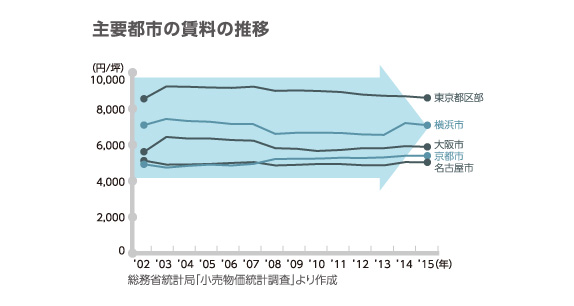 物価が下落し、世の中がデフレ傾向にある場合でも、賃貸住宅の賃料は大きく下がることはなくほぼ橫ばいとなります。これは都市部に限られた現象ではなく、全國共通の動きです。また、インフレで物価が上昇する場合には、インフレに連動して家賃は上昇する傾向があります。そのため、長期にわたり賃貸住宅の家賃収入が見込めます。