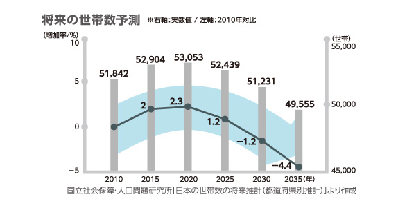 2005年頃をピークとして減少傾向にある日本の人口。それにより世帯數の減少が起こっているエリアもありますが、その減少率は、2010年から2035年にかけて-4.4%と見込まれています。一方で単身世帯は増加傾向にあり、2035年には2010年に比べて10%以上増加すると予想されています。
