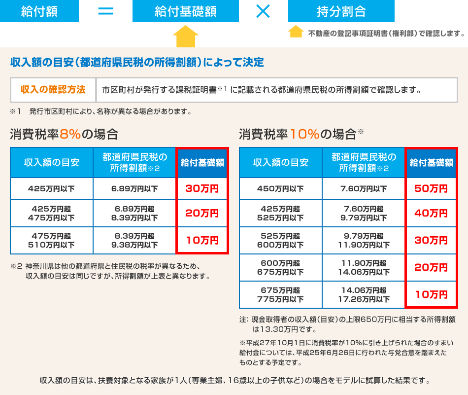 ※神奈川県は、県民稅の稅率が他の都道府県と異なるため、所得割額の區分が異なります。國土交通省『住まい給付金』のサイトへ http://sumai-kyufu.jp/