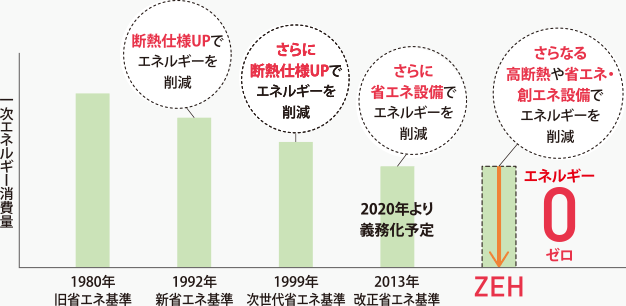 ZEH(ゼッチ)とは、ネット?ゼロ?エネルギー?ハウスの略稱。太陽光発電などで創ったエネルギー量が、宅內で使用したエネルギー量よりも多くなり、その結果、住宅內で使用したエネルギーが差し引きゼロ以下になるように作られている住宅です。斷熱?省エネ?創エネなどの條件を備えたZEHを建てると補助金がもらえます。