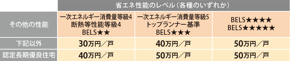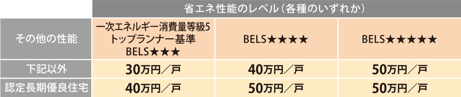 現行の耐震性を満たさない住宅を解體し、省エネルギー性に優れた住宅に建て替えすることで、30萬円/戸の補助を受けることができます。認定長期優良住宅や、さらに省エネ性能の高い住宅は、40萬円/戸または50萬円/戸となります。