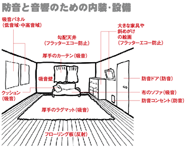 最近の住宅は気密性が高いため、音を吸収する布などが部屋の中にないと、音が響きすぎてしまいます。音が響く空間をライブな空間、響かない空間をデッドな空間といいますが、音を心地よく聞くには、音の反射と吸音のバランスがとれた環境が大切なのです。