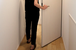 高田: お子さまを抱いていたり、荷物を抱えて手がふさがっていると、ドアの開閉ひとつでも大変です。この「シンクロ引分け戸」は、真ん中から左右に開くようになっていて、片手で一方の引戸を開けると、反対の引戸が連動(dòng)して同時(shí)に開きます。引戸を開閉するための手の動(dòng)作が通常の引戸のおよそ半分で済むため、荷物を抱えていても楽に開け閉めできるのです。