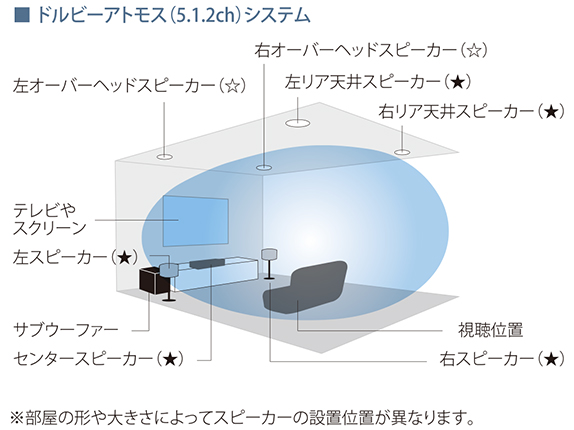 ドルビーアトモスシステムはこの概念を大きく覆し、5臺のスピーカー(★)と1臺のサブウーファーに加え、天井の2臺のスピーカー( ☆ )によって音を立體的に発生させます(5.1.2ch)。