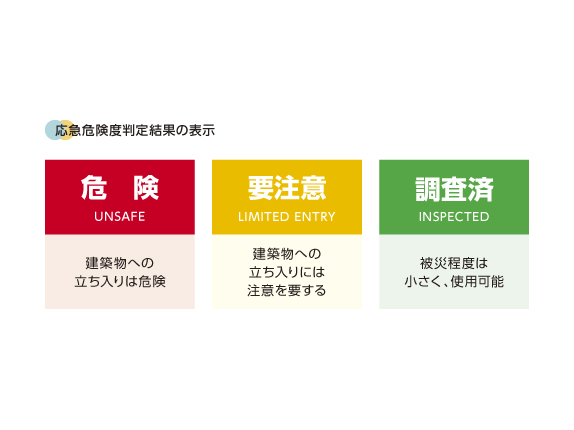 判定による調査結果は、「危険」「要注意」「調査済」の3種類のステッカーで示され、建物の出入り口などに掲示されます。赤いステッカーの「危険」は、倒壊の可能性がある場合など、立ち入ることが危険であることを意味します。黃色の「要注意」は、今すぐに危険を及ぼすものではないものの、余震などによって危険性が増す可能性があり、立ち入りに注意を要するもの。緑の「調査済」は、上記のどちらにも該當せず、継続使用に問題ないと判斷された場合に貼られます。