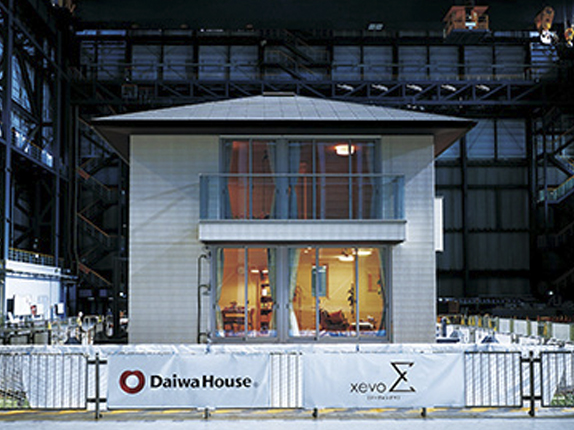 (実大の実験棟で連続加震実験を実施) ※國立研究開発法人 防災科學技術研究所の実大三次元震動破壊実験施設「E-ディフェンス」にて、2013年9月、xevoΣの大規模な加震実験を実施しました。