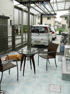 同じ外構工事をするのであれば、一部をタイル張りにしてガーデンファニチャーを置いて犬とのティータイムができ、雨降りでも濡れる事無く足洗い場が利用でき、物干し場にもなるテラス(不意の雨にも濡れる心配なし)とても使い勝手がいい物が出來あがりました。殘りの部分は雑草の生えないマットを敷き、五色の石を敷き詰め、見違える様な庭に成り、又草むしりの苦痛から解放されました。