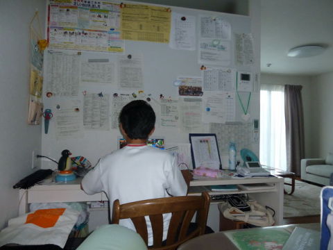 我が家では、子どもたちの學校行事?クラブチーム行事等予定が一度に見えるようにプリント等を貼れるスペースが欲しかったので壁の一部を磁石素材のものにしました。寫真のように、壁一面に色んな書類を貼っています。