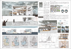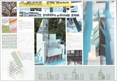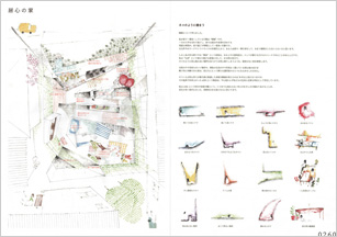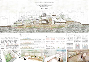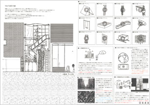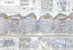 これまで日本の住宅は社會的背景やライフスタイル、技術の発展に応じて姿を変えてきたが、これから目指すグローバル社會においての住まいの環境はどうなるのだろうか。そこで外國人が街に融和することができるような建築を提案する。敷地は大阪の上町臺地に位置する寺町?夕陽丘。さまざまなヴォリュームと多方向からのアクセスが可能な道、大きな屋根で構成された舞臺建築を建てることで、既存の街のよさを発見し、日本人と外國人が交流できるパブリックスペースをつくり出す。 (応募案より抜粋)