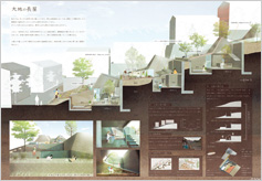 私たちはこれまで大地を耕し、農業を行い、作物を得る、基礎を打って建物を建てるなど「地」に基盤をおいて暮らしてきた。しかし、「地」を「土地」(低層部の需要増加による空室率の上昇)、「地面」(グランドレベルに依存した建築空間のあり方)、「大地」(自然環境との斷絶)の3つの視點でとらえると「地」は今過渡期を迎えている。そこで長い年月をかけて都市の隙間に大地を積層させていくことで「地」を街のインフラとして成立させ「地」との新しい関わり方を提案する。積層された大地が街を立體的に繋ぐことで空室率の高かった上層階の活性化、農業などのアクティビティ、立體的な動線などを生み出し、「地」を介した新しい暮らしを実現する。