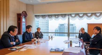 座談會風景。左から、八田氏、小堀氏、堀部氏、青木氏、平田氏。新型コロナウイルス感染癥予防対策を講じたうえで実施し、撮影時のみマスク?パーテーションを外した。