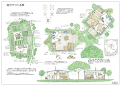 鹿児島県さつま町の過疎化した廃校のある空農地に自らの手で住まいと作物をつくる。自らつくる家の大きさは古代の竪穴式住居から、家族の納まる最小寸法を現代の自動車から考察し間口5m角、高さ2.4mとした。ランドスケープは中心にある梅の大木が擔い、四季で行動を示唆する。人間の體は10,000年後も変わらない。五感の屆く距離で寄り添う住まいこそ原型であり、未來と考える。自然の恵みで生かされ脅威で命を學ぶ、地に足をつけた暮らしは現代社會では気付けない小さな幸せが訪れる。すべての環境と生物は互いに笑みを浮かべ永遠を願う。(応募案より抜粋)