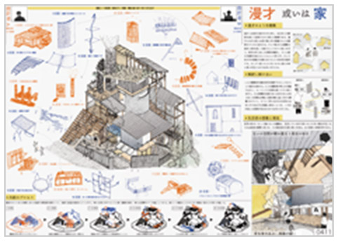 先日、五十嵐太郎氏の「景観を笑う」という巻頭論文(『新建築』0412)を読みました。その中で、チェコ出身の作家であるミラン?クンデラの「ふたつの笑い」を引用していました(『笑いと忘卻の書』、集英社、1992年)。「悪魔の笑い」は無秩序でキッチュなものを笑うアイロニーであり「天使の笑い」は秩序や人生の価値、不滅性を稱揚する微笑みです。しかし、どちらかの笑いで埋めつくされた世界は悲劇にもなります。笑いにはそのようなある意味での暴力性も孕んいるともいえます。その點において、最優秀賞の「余白と結構Ⅰ」は秩序立つプランニングと斷片の間に生じる運動が何に繋がるのか分からない風景を描いており、いちばん興味をそそられました。また、優秀賞の「空中アトリエ」は建築のいろいろな見方を提示してくれました。