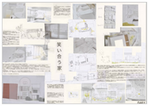 人はストレスや緊張が高まった狀態で笑いが引き起こる。これは笑いが緊張の解消手段として働き、リラックスさせる効果をもつ。私たちは日常で直面する緊張を和らげることで笑みをこぼしている。そこで「笑う家」とは住宅に必要とされる緩和に、緊張を付加し人同様に成り立つと考え、過度な緩和を実現している規格住宅の改修を行った。緩和主體の住宅の形態に緊張が生じるような要素を挿入し、人のストレス、建築のテンションを與え、住宅全體に緊張が伝播していく操作を加え住宅が生きているように知覚させ、住宅が緊張と緩和を有して住民の暮らしを受け入れることを目指した。(応募案より抜粋)
