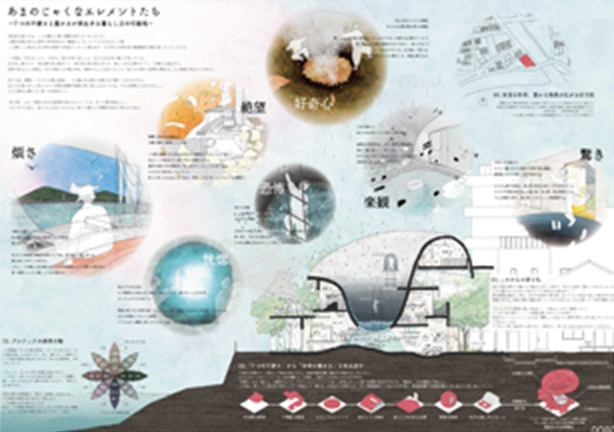 現代的な私たちは、いつの間にか家に感情をもたなくなっていた。人間の欲望の果てに何不自由ない機械のようにつくりかえられていく家。私たちは同じ日常を無意識的に繰り返している。笑う家とは「あまのじゃく」である。自分を見てほしいと、足を引っ掛けたり、落ち葉を集めたり、家の中に雨を降らせたりして私たちのさまざまな感情に觸れることに快楽を覚えている。しかし、そんな家の振る舞いが、鬱陶しくも家に対して失っていた多様な感覚を思い起こさせてくれるのではないだろうか。ここでは私自身の経験に基づいた7つのエレメントをデザインし、形態を変化させながら、大學生5人のシェアハウスを計畫する。(プレゼンテーションより抜粋)