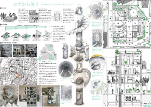 水という自然要素は古來から私たちの生活と精神に関係していた。仏教の中でも、「水=欲」という考え方がある。人びとの欲が快適に満たされている都市社會では、日常生活の中で苦労した後のほっとする笑いが少なくなった。これに対して私がもう一度人と水の関係性を熟視したら、都市にいる人間が自ら笑えるのではないかと考えた。井戸から水を汲み上げる行動では、水を得るだけではなく、人はその過程で精神的なストレスを解消していくこともある。今回の提案では、井戸から水を取るような一見不便とされる行為を計畫に取り入れることとした。人びとが水との営みを通して、ほっとする。(プレゼンテーションより抜粋)
