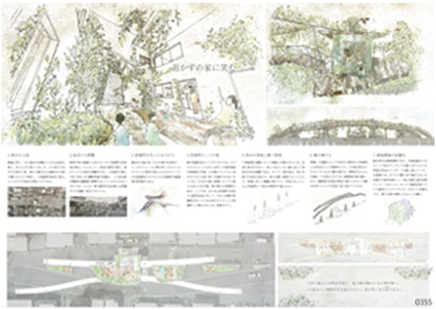 道路拡張に伴う立ち退きを拒否した一軒の家。その家を避けるように灣曲した道路。道路で隔たれた両岸に殘る殺風景な三角地帯。一軒の空き家が生んだその不條理を人びとは嘲笑する。その狹小な三角地帯に鉄塔、小屋を施し、X狀の橋を架け繋ぐ。次第にそこは子供たちや動植物の居場所へと還元され、誰もがその橋を渡り始める。看板建築である空き家は一部が外部化されることで子供たちのたまり場、町の新たな看板へと生まれ変わる。時を経て頭上に草木が茂り、緑のルーフが架かると大きなひとつの家のような風景が生まれる。もうこの家は嘲笑される家ではない。みなが集い、笑い合う家だ。(プレゼンテーションより抜粋)