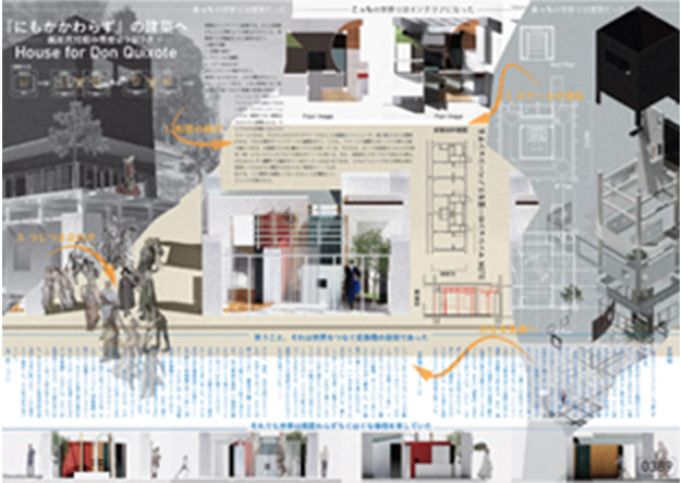 かつて物語の世界と現実の世界という異なる位相が混ざってしまったがゆえに數奇な人生を送ったドン?キホーテ。彼は異なる世界を繋ぐことのできる「変換機」を必要としていたのではないか。それが現代になってやっと実現する契機を得たのかもしれない。本提案では、「拡大?縮小」という時間的、空間的な斷絶をもたらすと同時に、次なる何かへと接続をもたらす両極的で現代的な操作を試みる。そうして本來はまったく関係のなかった建築物がインテリアへと変換されていく。それは「ドン?キホーテ」がみせたユーモアの構造そのものであり、それを建築設計方法論として組み立てることでその可能性を探る。 (プレゼンテーションより抜粋)