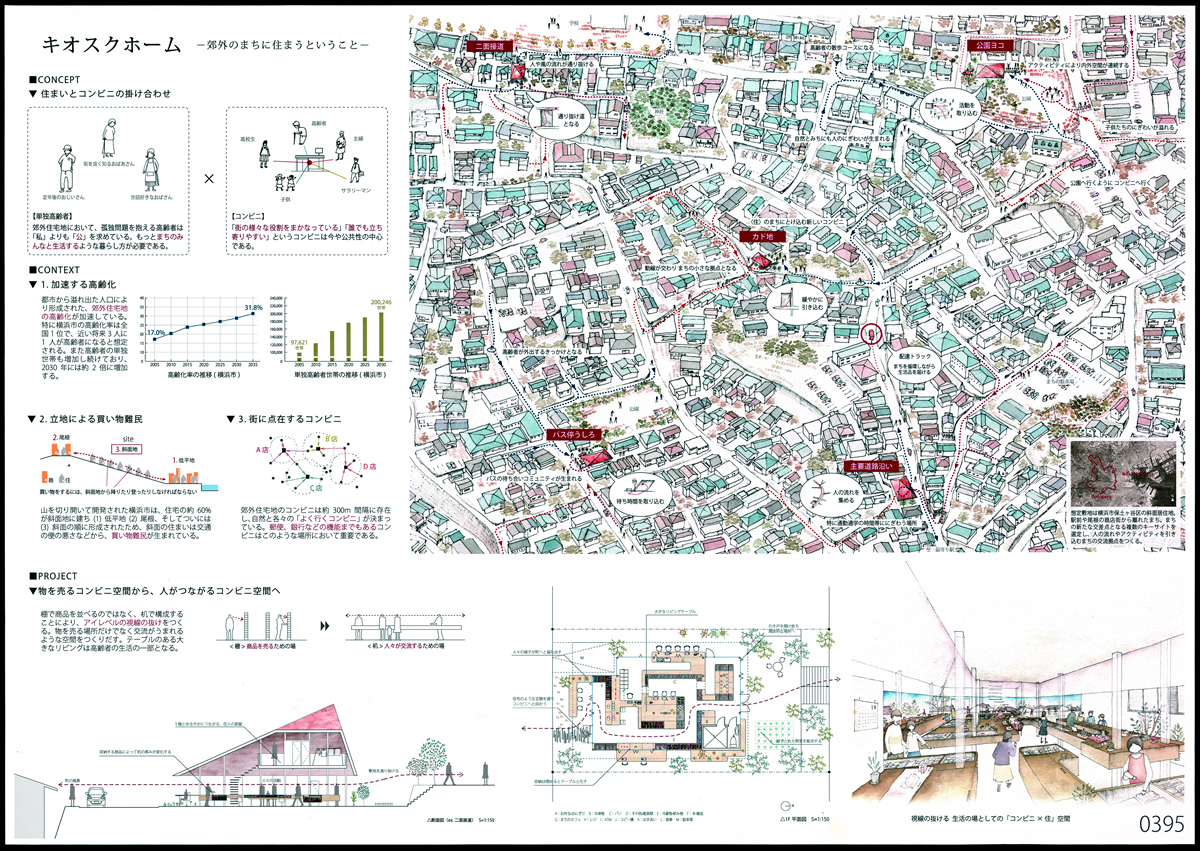 加速する高齢化、斜面の多い立地による買い物難民、街に點在するコンビニ、という3つの文脈をもつ郊外住宅地において、街にコミュニティを求める単獨高齢者と、誰でも気軽に訪れることのできるコンビニを掛け合わせた居職を提案する。徒歩300m間隔に住民の動線から導いた領域を複數想定し、居職の場を點在させる。配達トラックが循環することで、各領域をつないでいく。大屋根を架けた建築の1階は誰でも訪れられる職としてのコンビニ空間、2階を単獨高齢者の住まいとする。棚ではなく大きな機で構成されたコンビニは、リビングのような交流の場となり、2階の住空間からも街の気配を感じることができる。 (プレゼンテーションより抜粋)