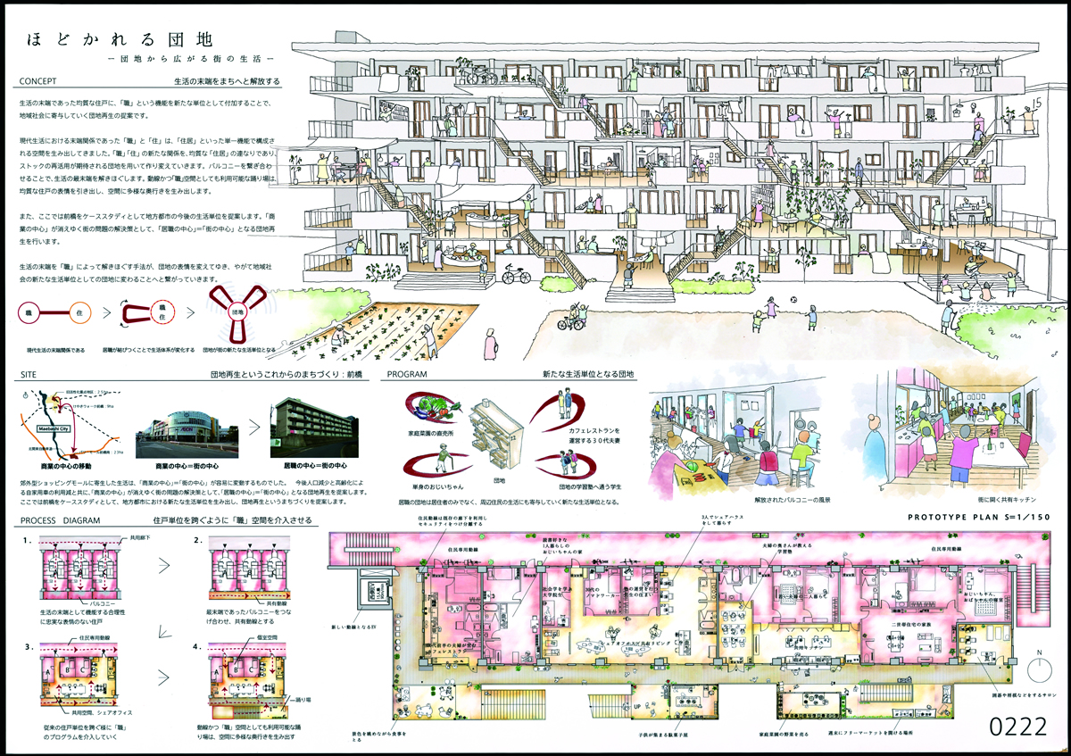職と住の新たな関係を、均質な住居の連なりでありストックの再活用が期待される団地で考える。職が住居の単位をまたいでいくことで住まいを解きほどき、居住者のみでなく、周辺住民の生活にも寄與していく。敷地は地方都市、前橋。現狀の団地では住戸ごとに生活が完結しており、団地の均質な表情をつくり出している。そこで末端にあるバルコニーをつなぎ合わせ、パブリックな共有動線として開放する。さらに従來の住戸単位をまたぐようなかたちでさまざまな職のプログラムを介入させ、バルコニーに対して上下階の動線として機能する階段、踴り場を足す。そこは職空間としても利用され、多様な奧行きと賑わいを生み出す。 (プレゼンテーションより抜粋)